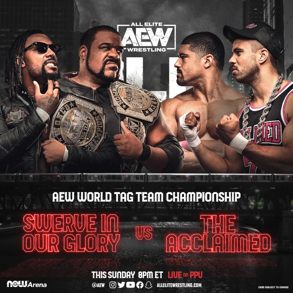 AEW Tag Team Championship: This was not the match we expected for the tag titles, but it is a solid back up as newly crowned Swerve in our Glory (Came up with that name first before they did FYI) defend their tag titles against fan favorites The Acclaimed. This should be a solid match, but I am going with an upset here and say the Acclaimed finally win and become the new AEW Tag Team champions and it begins the split between Keith Lee and Swerve Strickland.