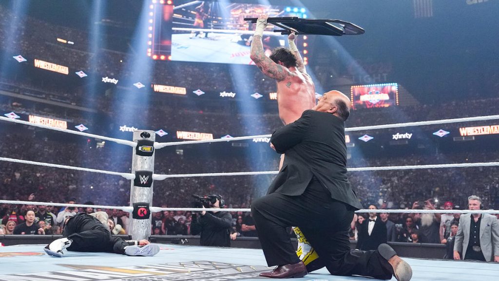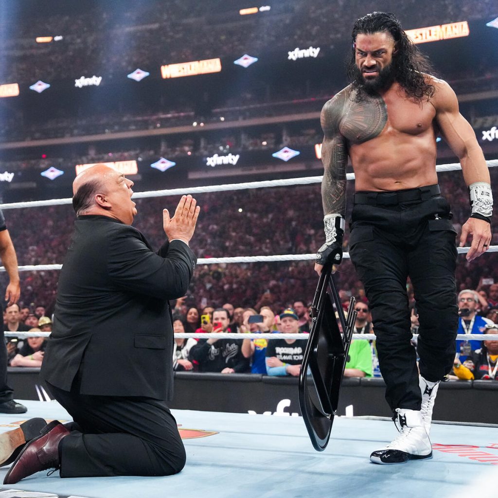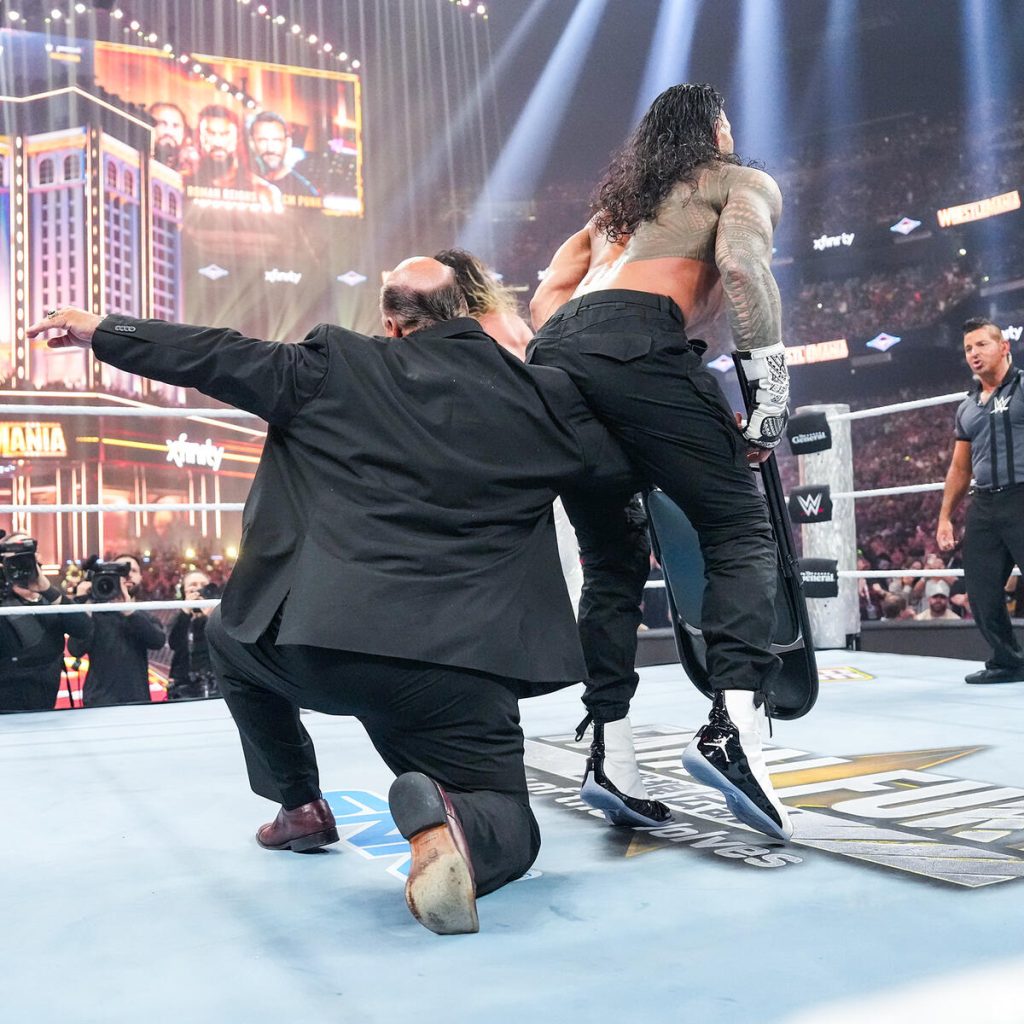 The first betrayal happens when Paul Heyman hits Punk with a low blow, shocking everyone, including Reigns, who is happy and relieved when Heyman presents Reigns with the chair. Seth Rollins starts to come to when Heyman instructs Reigns to hit Rollins like Rollins did him over a decade ago, which started it all.