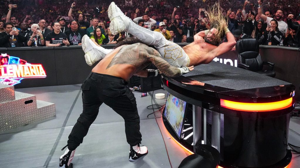 Reigns finally breaks and seems to agree with Rollins setting Punk up for the Shield bomb through the announce table when Reigns knocks Rollins out, then power bombs Punk and Rollins through both announce tables. After all three men are down from each other’s big shots, we see when and how Paul Heyman will influence this match. When he grabs a chair, who is it for? Reigns sees the chair, but Heyman apologizes as he gives the chair to Punk as he enters the ring so Punk can attack Reigns and Rollins.