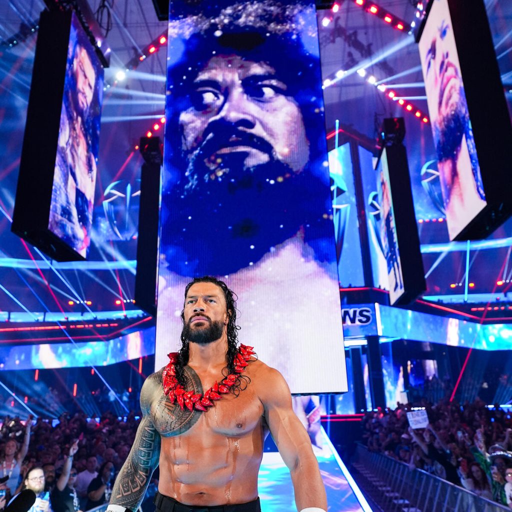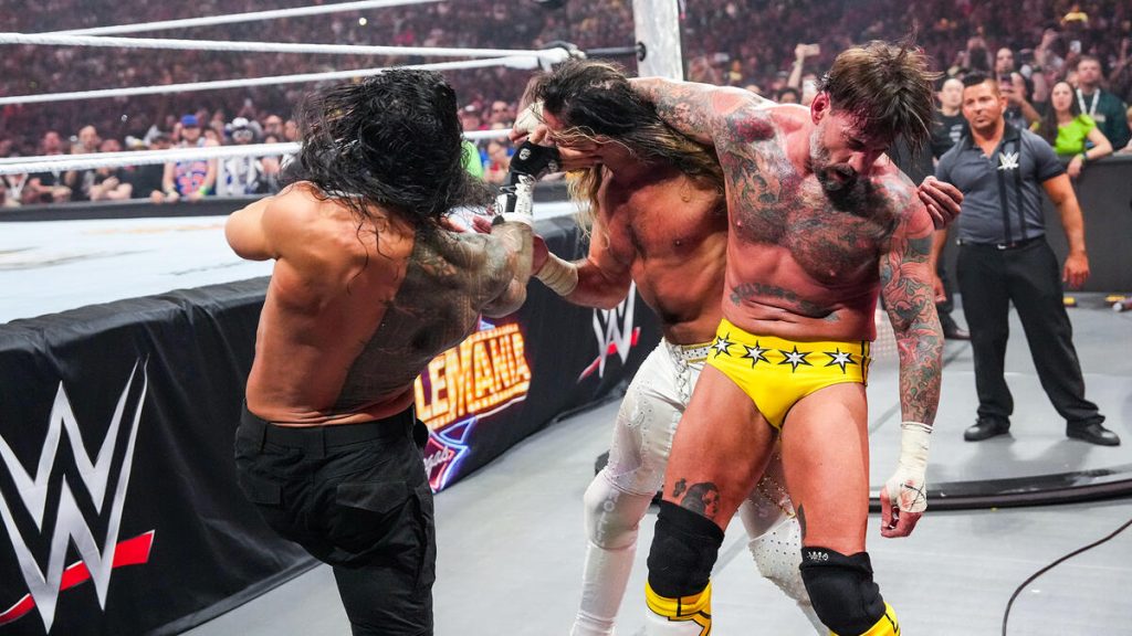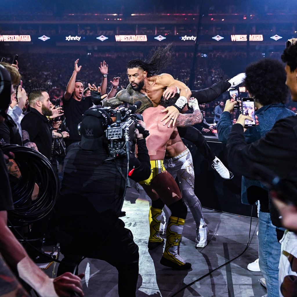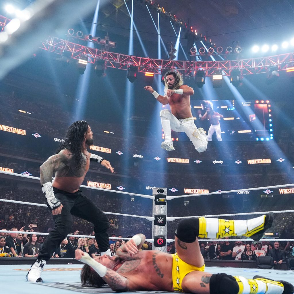 The highly anticipated triple threat was next, and man, you couldn’t get a bigger fight, star-powered, Wrestlemania main event match than this. The entrances were amazing. Rollins never disappoints with a gear change mid-entrance, doing some HBK from Wrestlemania 25. Roman Reigns didn’t need much; his presence or aura is enough, but the panels showing all the bloodline members were excellent. Then the video package for CM Punk was incredible as it highlights Punk’s career.