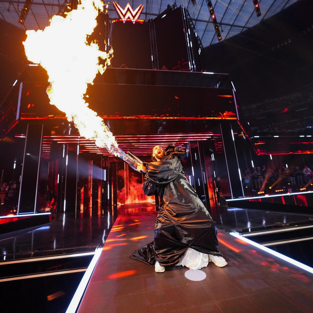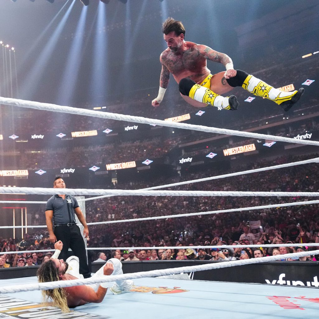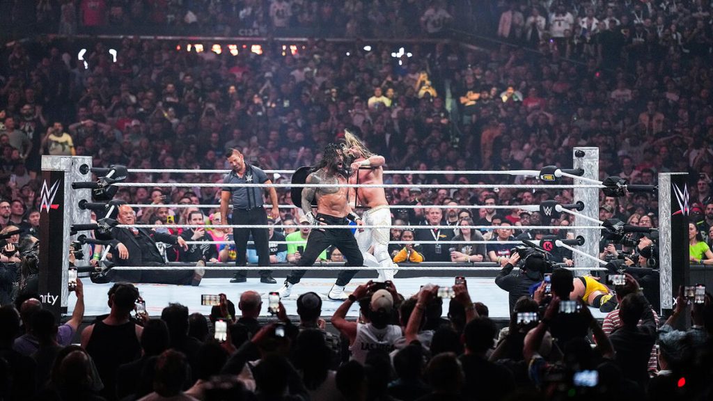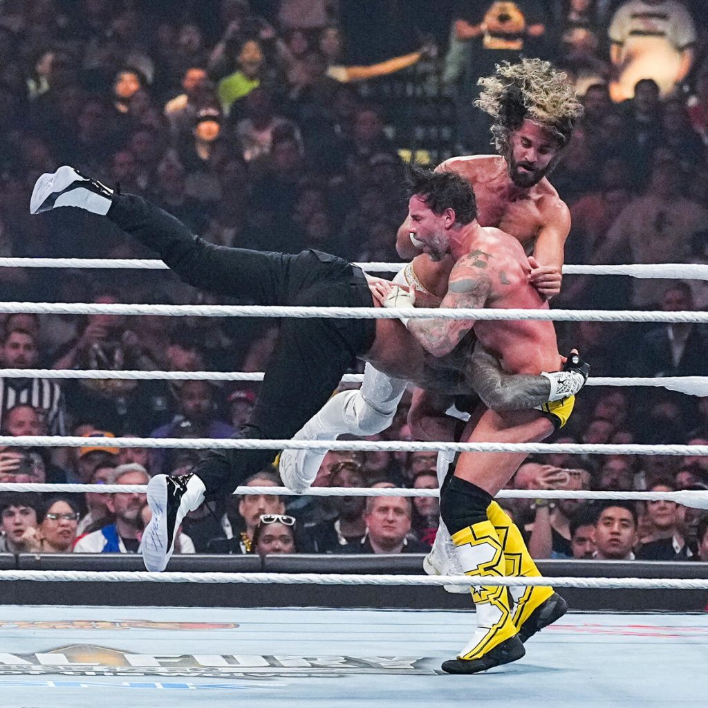 The highly anticipated triple threat was next, and man, you couldn’t get a bigger fight, star-powered, Wrestlemania main event match than this. The entrances were amazing. Rollins never disappoints with a gear change mid-entrance, doing some HBK from Wrestlemania 25. Roman Reigns didn’t need much; his presence or aura is enough, but the panels showing all the bloodline members were excellent. Then the video package for CM Punk was incredible as it highlights Punk’s career.