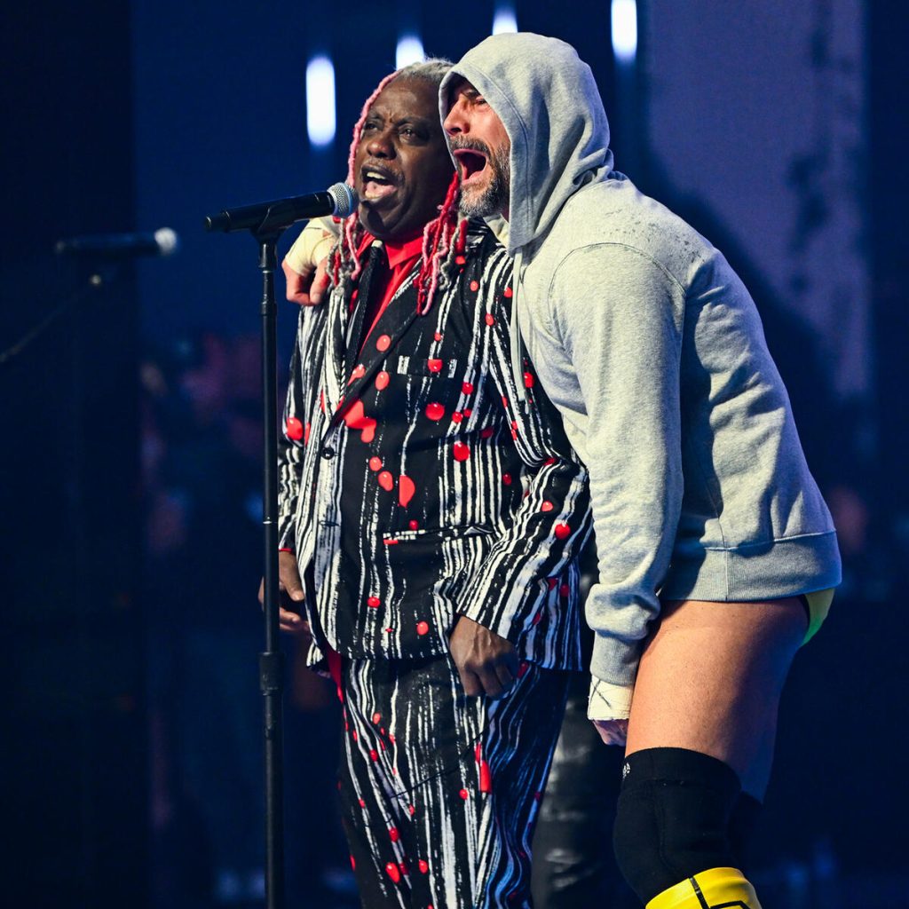 Then we see Living Colour on stage when that famous riff starts, and out comes Punk with Paul Heyman, who is genuinely happy signing with the band and gets his wish of main eventing Wrestlemania with his best friend walking beside him. The bell rings, and the energy takes over for the first minute or so of the match.